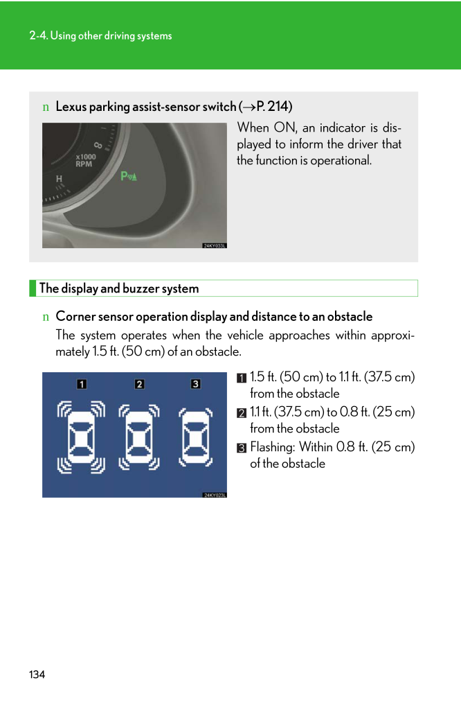 1342-4. Using other driving systemsThe display and buzzer systemn Corner sensor operation display and distance to an obstacle The system operates when the vehicle approaches within approxi-mately 1.5 ft. (50 cm) of an obstacle. 1.5 ft. (50 cm) to 1.1 ft. (37.5 cm)from the obstacle 1.1 ft. (37.5 cm) to 0.8 ft. (25 cm)from the obstacle Flashing: Within 0.8 ft. (25 cm)of the obstacle n Lexus parking assist-sensor switch (→ P. 214)When ON, an indicator is dis-played to inform the driver thatthe function is operational.