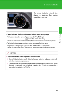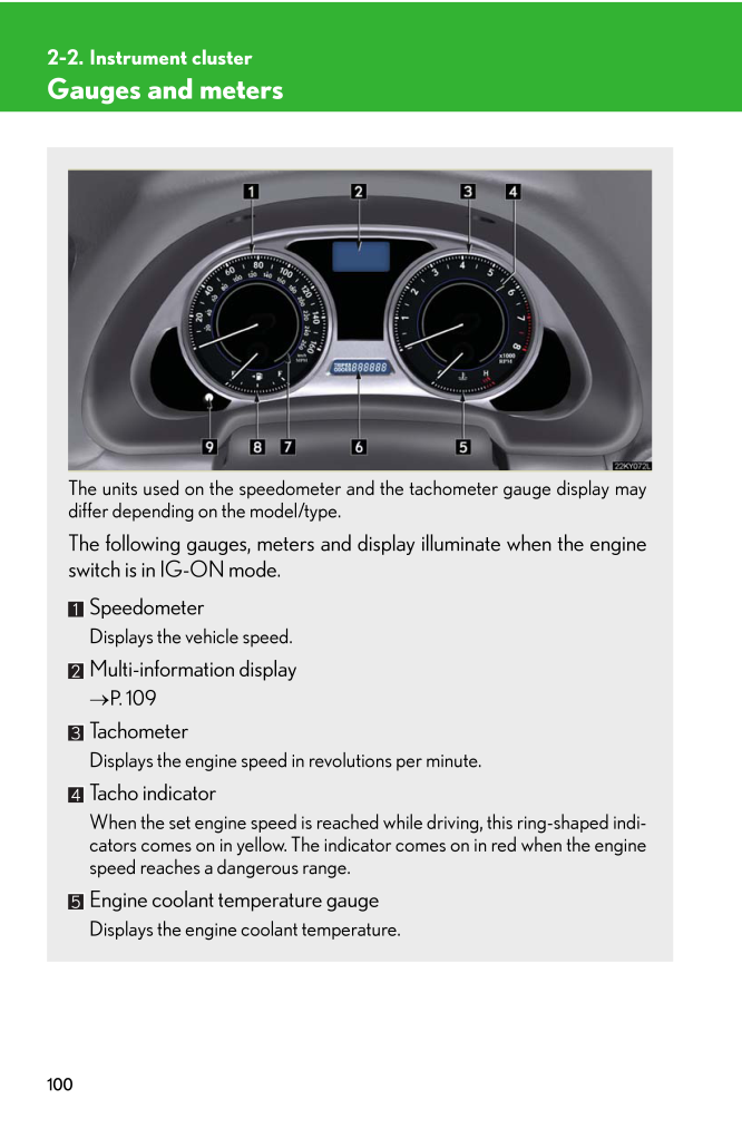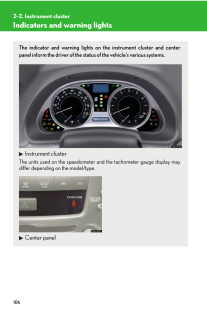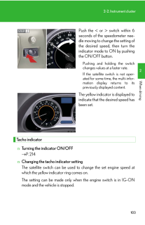 1002-2. Instrument clusterGauges and metersThe units used on the speedometer an d the tachometer gauge display maydiffer depending on the model/type. The following gauges, meters and display illuminate when the engineswitch is in IG-ON mode.SpeedometerDisplays the vehicle speed. Multi-information display→ P. 109TachometerDisplays the engine speed in revolutions per minute.Tacho indicator When the set engine speed is reached while driving, this ring-shaped indi-cators comes on in yellow. The indicator comes on in red when the enginespeed reaches a dangerous range.Engine coolant temperature gaugeDisplays the engine coolant temperature.
