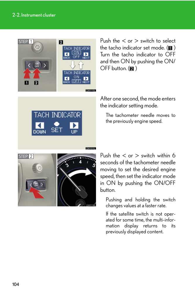 1042-2. Instrument clusterPush the < or > switch to selectthe tacho indicator set mode. ( )Turn the tacho indicator to OFFand then ON by pushing the ON/OFF button. ( )After one second, the mode entersthe indicator setting mode.The tachometer needle moves tothe previously engine speed.Push the < or > switch within 6seconds of the tachometer needlemoving to set the desired enginespeed, then set the indicator modein ON by pushing the ON/OFFbutton.Pushing and holding the switchchanges values at a faster rate. If the satellite switch is not oper-ated for some time, the multi-infor-mation display returns to itspreviously displayed content.STEP 1STEP 2