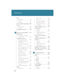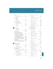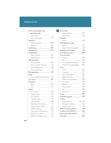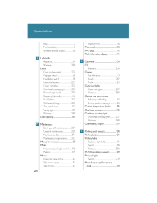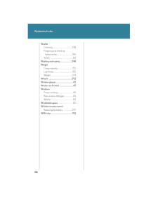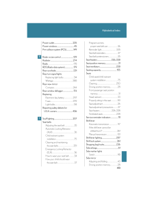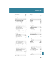 408Alphabetical indexAlphabetical indexA/C (Air conditioning system)........166ABS (Anti-lock brake system).........144AFS (Adaptive front lighting system)......................................................119Adaptive front lighting system (AFS)..........................................................119Air conditioning filter..........................295Air conditioning system (A/C)Air conditioning filter.......................295Automatic air conditioning system....................................................166AirbagsAirbag operating conditions...........63Airbag precautions for your child..........................................................67Airbag warning light........................334Curtain shield airbag operating conditions..............................................63Curtain shield airbag precautions..........................................67General airbag precautions...........67Locations of airbags..............................61Modification and disposal of airbags......................................................71Proper driving posture.............59, 67Side airbag operating conditions..............................................63Side airbag precautions....................67SRS airbags...............................................61Alarm............................................................56Antenna.....................................................183Anti-lock brake system (ABS).........144Armrest.....................................................230Ashtrays....................................................223Audio systemAntenna...............................................183AUX adapter.......................................204CD player/changer...........................186MP3/WMA disc.................................193Optimal use...........................................201Radio.........................................................178Steering wheel audio switch........205Automatic air conditioning system......................................................166Automatic headlight leveling system.....................................................120Automatic light control system..........118Automatic transmissionAutomatic transmission.....................97If the shift lever cannot be shifted from P.....................................361S mode.......................................................99AUX adapter.........................................204BA (Brake assist)....................................144Back-up lightsWattage.................................................388BatteryChecking................................................275If the vehicle has discharged battery.................................................366Preparing and checking before winter......................................156Bottle holders...........................................215BrakeFluid...........................................................274Parking brake........................................104Brake assist (BA)....................................144CareExterior...................................................248Interior.....................................................250Seat belts.................................................251ABC