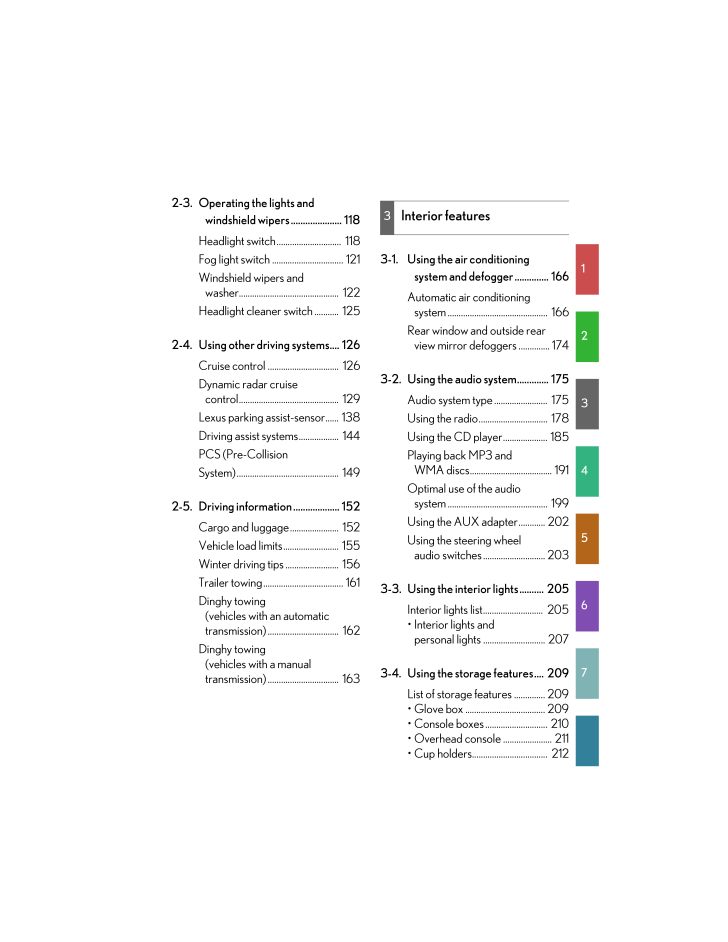 12345672-3. Operating the lights and windshield wipers..................... 118Headlight switch............................. 118Fog light switch................................ 121Windshield wipers and washer............................................. 122Headlight cleaner switch........... 1252-4. Using other driving systems.... 126Cruise control................................ 126Dynamic radar cruise control............................................. 129Lexus parking assist-sensor...... 138Driving assist systems.................. 144PCS (Pre-Collision System).............................................. 1492-5. Driving information................... 152Cargo and luggage...................... 152Vehicle load limits......................... 155Winter driving tips........................ 156Trailer towing.................................... 161Dinghy towing (vehicles with an automatic transmission)................................ 162Dinghy towing (vehicles with a manual transmission)................................ 1633-1. Using the air conditioning system and defogger.............. 166Automatic air conditioning system............................................. 166Rear window and outside rear view mirror defoggers.............. 1743-2. Using the audio system............. 175Audio system type........................ 175Using the radio............................... 178Using the CD player.................... 185Playing back MP3 and WMA discs..................................... 191Optimal use of the audio system............................................. 199Using the AUX adapter............ 202Using the steering wheel audio switches............................ 2033-3. Using the interior lights.......... 205Interior lights list........................... 205*Interior lights and personal lights............................ 2073-4. Using the storage features.... 209List of storage features.............. 209*Glove box.................................... 209*Console boxes............................ 210*Overhead console...................... 211*Cup holders.................................. 2123Interior features