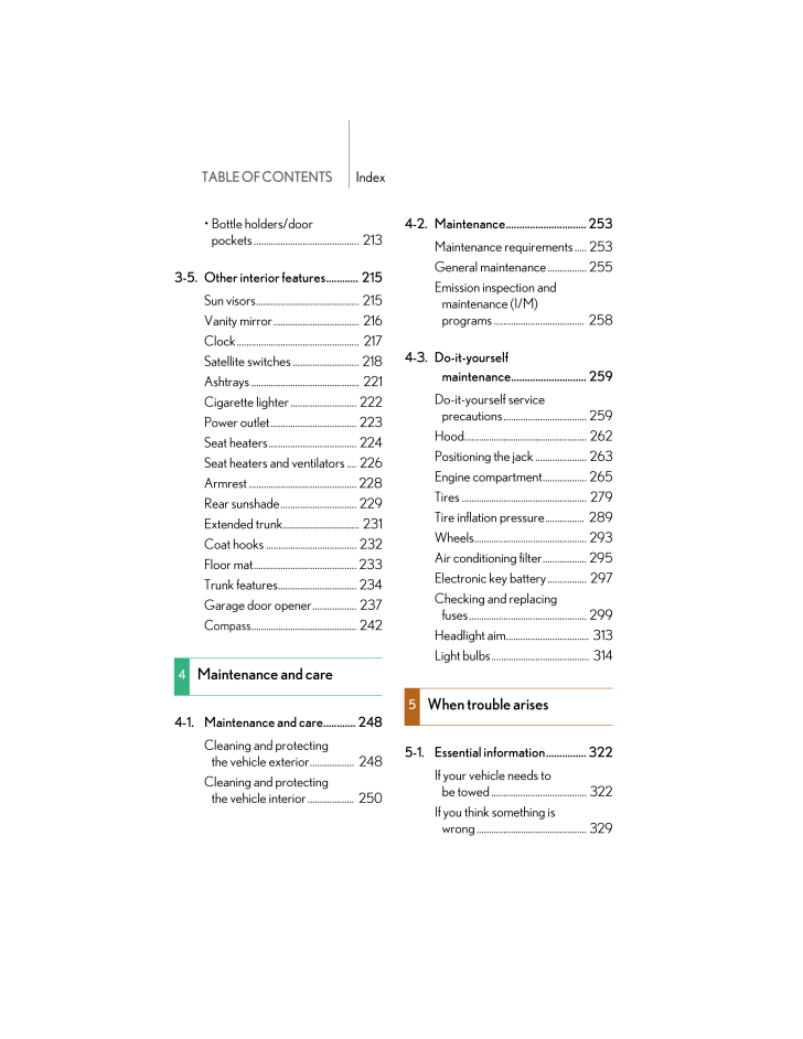 TABLE OF CONTENTS Index*Bottle holders/door pockets........................................... 2133-5. Other interior features............ 215Sun visors.......................................... 215Vanity mirror................................... 216Clock.................................................. 217Satellite switches........................... 218Ashtrays............................................ 221Cigarette lighter........................... 222Power outlet................................... 223Seat heaters.................................... 224Seat heaters and ventilators.... 226Armrest............................................ 228Rear sunshade............................... 229Extended trunk............................... 231Coat hooks..................................... 232Floor mat.......................................... 233Trunk features................................ 234Garage door opener.................. 237Compass ........................................... 2424-1. Maintenance and care............ 248Cleaning and protecting the vehicle exterior.................. 248Cleaning and protecting the vehicle interior................... 2504-2. Maintenance.............................. 253Maintenance requirements..... 253General maintenance................ 255Emission inspection and maintenance (I/M) programs..................................... 2584-3. Do-it-yourself maintenance............................ 259Do-it-yourself service precautions.................................. 259Hood.................................................. 262Positioning the jack..................... 263Engine compartment.................. 265Tires................................................... 279Tire inflation pressure................ 289Wheels.............................................. 293Air conditioning filter.................. 295Electronic key battery................ 297Checking and replacing fuses................................................ 299Headlight aim.................................. 313Light bulbs........................................ 3145-1. Essential information............... 322If your vehicle needs to be towed....................................... 322If you think something is wrong............................................. 3294Maintenance and care5When trouble arises