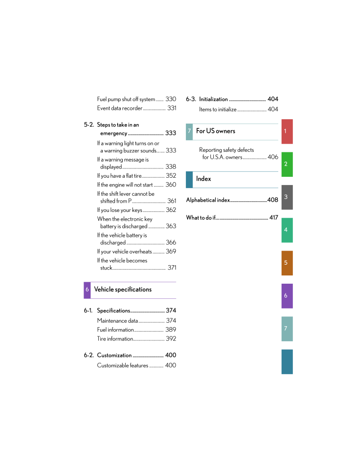 1234567Fuel pump shut off system....... 330Event data recorder..................... 3315-2. Steps to take in an emergency.............................. 333If a warning light turns on or a warning buzzer sounds....... 333If a warning message is displayed...................................... 338If you have a flat tire..................... 352If the engine will not start......... 360If the shift lever cannot be shifted from P............................... 361If you lose your keys.................... 362When the electronic key battery is discharged............... 363If the vehicle battery is discharged................................... 366If your vehicle overheats........... 369If the vehicle becomes stuck................................................. 3716-1. Specifications............................. 374Maintenance data........................ 374Fuel information........................... 389Tire information............................. 3926-2. Customization.......................... 400Customizable features............. 4006-3. Initialization............................... 404Items to initialize........................... 404Reporting safety defects for U.S.A. owners...................... 406Alphabetical index...............................408What to do if............................................4176Vehicle specifications7For US ownersIndex