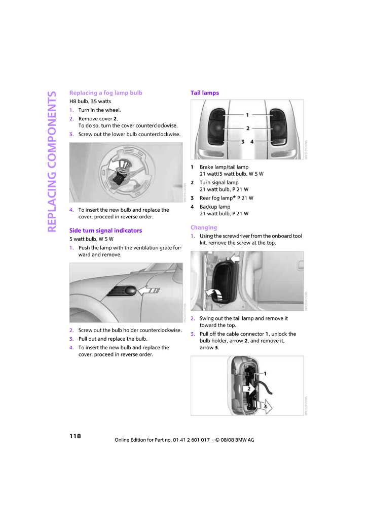 Replacing components118Replacing a fog lamp bulbH8 bulb, 35 watts1.Turn in the wheel.2.Remove cover 2.To do so, turn the cover counterclockwise.3.Screw out the lower bulb counterclockwise.4.To insert the new bulb and replace the cover, proceed in reverse order.Side turn signal indicators5 watt bulb, W 5 W1.Push the lamp with the ventilation grate for-ward and remove.2.Screw out the bulb holder counterclockwise.3.Pull out and replace the bulb.4.To insert the new bulb and replace the cover, proceed in reverse order.Tail lamps1Brake lamp/tail lamp21 watt/5 watt bulb, W 5 W2Turn signal lamp21 watt bulb, P 21 W3Rear fog lamp* P 21 W4Backup lamp21 watt bulb, P 21 WChanging1.Using the screwdriver from the onboard tool kit, remove the screw at the top.2.Swing out the tail lamp and remove it toward the top.3.Pull off the cable connector 1, unlock the bulb holder, arrow 2, and remove it, arrow3.