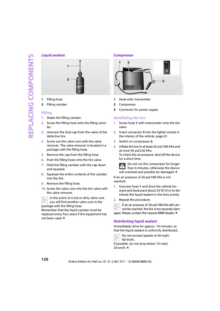 Replacing components120Liquid sealant1Filling hose2Filling canisterFilling1.Shake the filling canister.2.Screw the filling hose onto the filling canis-ter.3.Unscrew the dust cap from the valve of the defective tire.4.Screw out the valve core with the valve remover. The valve remover is located in a package with the filling hose.5.Remove the cap from the filling hose.6.Push the filling hose onto the tire valve.7.Hold the filling canister with the cap down and squeeze.8.Squeeze the entire contents of the canister into the tire.9.Remove the filling hose.10.Screw the valve core into the tire valve with the valve remover.In the event of a lost or dirty valve core you will find another valve core in the package with the filling hose. Remember that the liquid canister must be replaced every four years if the equipment has not been used.<Compressor1Hose with manometer2Compressor3Connector for power supplyReinflating the tire1.Screw hose1 with manometer onto the tire valve.2.Insert connector 3 into the lighter socket in the interior of the vehicle, page 81.3.Switch on compressor 2.4.Inflate the tire to at least 26 psi/180 kPa and at most 36 psi/250 kPa.To check the air pressure, shut off the device for a short time.Do not run the compressor for longer than 6 minutes, otherwise the device will overheat and possibly be damaged. <If an air pressure of 26 psi/180 kPa is not reached:1.Unscrew hose 1 and drive the vehicle for-ward and backward about 33 ft/10 m to dis-tribute the liquid sealant in the tires evenly.2.Repeat the procedure.If an air pressure of 26psi/180 kPa still can-not be reached, the tire is too severely dam-aged. Please contact the nearest MINI Dealer. <Distributing liquid sealantImmediately drive for approx. 10 minutes, so that the liquid sealant is uniformly distributed.Do not exceed speeds of 40 mph/60 km/h.If possible, do not drop below 10 mph/20 km/h.<