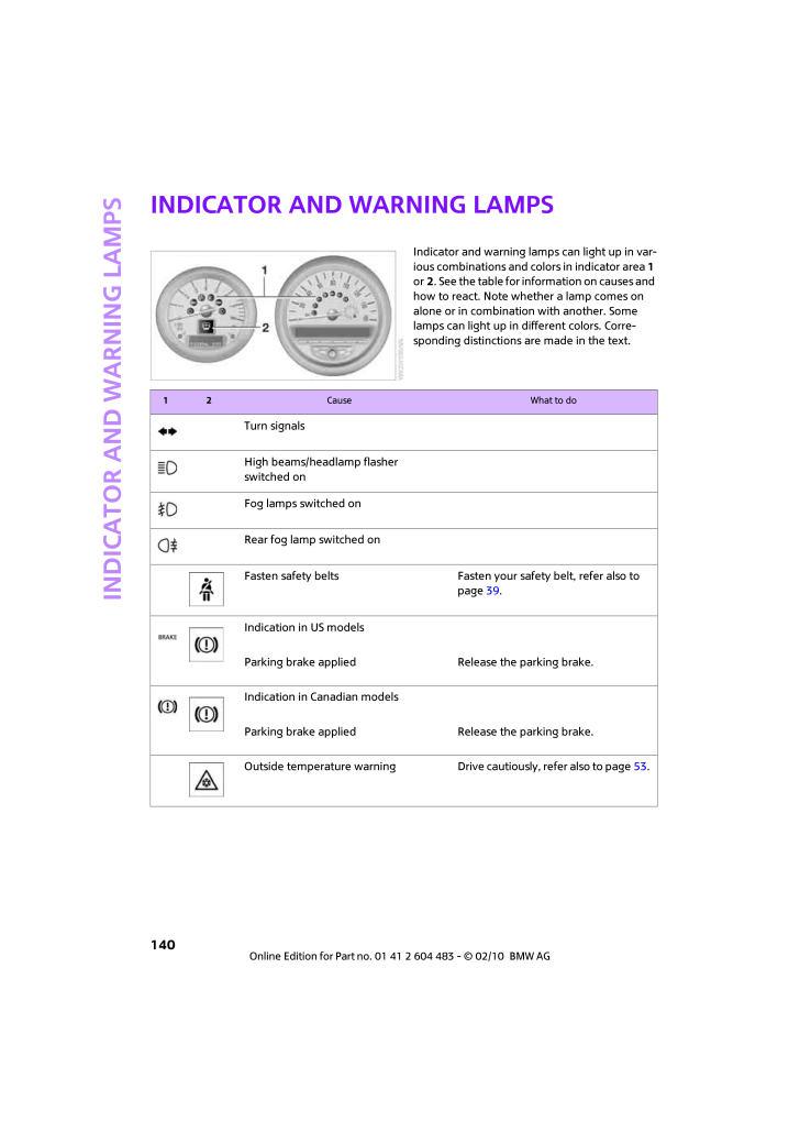Indicator and warning lamps140Indicator and warning lampsIndicator and warning lamps can light up in var-ious combinations and colors in indicator area  1 or2. See the table for information on causes and how to react. Note whether a lamp comes on alone or in combination with another. Some lamps can light up in different colors. Corre-sponding distinctions are made in the text.1 2 Cause  What to doTurn signalsHigh beams/headlamp flasher switched onFog lamps switched onRear fog lamp switched onFasten safety belts Fasten your safety belt, refer also to page39.Indication in US modelsParking brake applied Release the parking brake.Indication in Canadian modelsParking brake applied Release the parking brake.Outside temperature warning Drive cautiously, refer also to page 53.