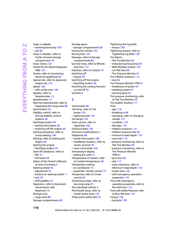 Everything from A to Z170Snap-in adapter- inserting/removing 109- use98Snap-in adapter, refer to Center armrest storage compartment79Snow chains120Socket for On-Board Diagnosis OBD125Socket, refer to Connecting electrical appliances 82Special oils, refer to Approved engine oils123Speed158- with winter tires 120Speedo, refer to Speedometer12Speedometer12Split rear seat backrest, refer to Expanding the cargo area 88Sport button59Stability control, refer to Driving stability control systems56Start/Stop button39- starting the engine 40- switching off the engine 40Starting assistance, refer to Jump-starting140Starting, refer to Starting the engine40Starting the engine- Start/Stop button 39Start-off assistance, refer to- DSC57- Hill Assist58Status of this Owner's Manual at time of printing4Steering wheel35- adjustment35- buttons on steering wheel 11- lock39- shift paddles42Steptronic, refer to Automatic transmission with Steptronic41Storage area- cargo area88Storage compartments 80Storage space- storage compartments 80Storing the vehicle 130Storing tires120Stowage, refer to Storage compartments80Summer tires, refer to Wheels and tires114Switches, refer to Cockpit 10Switching off- engine40Switching off the engine- Start/Stop button 39Switching the cooling function on and off76Symbols4TTachometer48Tail lamp, refer to Tail lamps134- replacing bulb134Tail lamps134Tank volume, refer to Capacities160Technical data158Technical modifications 5Telephone98- hands-free system 106- installation location, refer to Center armrest79- voice commands 106Temperature display- setting the units 51Temperature of coolant, refer to Coolant temperature 48Temperature setting- air conditioner73- automatic climate control 75Tempomat, refer to Cruise control46Tensioning straps, refer to Securing cargo91The individual vehicle 4Third brake lamp, refer to Center brake lamp 135Three-point safety belt 33Tightening the lug bolts- torque138Tightening torque, refer to Tightening lug bolts 138Tire failure- Flat Tire Monitor 60- indicator/warning lamp 60- MINI Mobility System 135- run-flat tires60- Tire Pressure Monitor 61Tire inflation pressure 114- loss60Tire Pressure Monitor TPM 61- limitations of system 61- resetting system 61- warning lamp62Tire pressure monitoring, refer to Flat Tire Monitor 59Tire Quality Grading 117Tires- age118- breaking in86- changing, refer to Changing wheels137- condition118- damage118- inflation pressure 114- inflation pressure loss 62- minimum tread depth 118- new tires119- pressure monitoring, refer to Flat Tire Monitor59- pressure monitoring, refer to Tire Pressure Monitor TPM61- puncture60- size117- wear indicators, refer to Minimum tread depth 118- winter tires120- with emergency operation properties119Tires with emergency operation properties, refer to Run-flat tires119Tires with safety features, refer to Run-flat tires119Torque158- lug bolts138