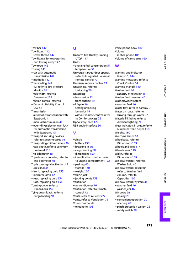 171AT A GLANCE Reference Mobility Controls Driving tips CommunicationsTow bar142Tow fitting142- screw thread142Tow fittings for tow-starting and towing away142Tow rope142Towing141- car with automatic transmission142- methods142Tow-starting141TPM, refer to Tire Pressure Monitor61Track width, refer to Dimension159Traction control, refer to- Dynamic Stability Control DSC57Transmission- automatic transmission with Steptronic41- manual transmission 41- overriding selector lever lock for automatic transmission with Steptronic43Transport securing devices, refer to Securing cargo 91Transporting children safely 36Tread depth, refer to Minimum tire tread118Trip odometer48Trip-distance counter, refer to Trip odometer48Triple turn signal activation 43Turn signal43- front, replacing bulb 133- indicator lamp12- rear, replacing bulb 134- side, replacing bulb 134Turning circle, refer to Dimensions159Tying down loads, refer to Cargo loading91UUniform Tire Quality Grading UTQR117Units- average fuel consumption 51- temperature51Universal garage-door opener, refer to Integrated universal remote control77Universal remote control 77Unlatching, refer to Unlocking26Unlocking- from inside22- from outside19- liftgate26- setting unlocking behavior19- without remote control, refer to Comfort Access 25Upholstery, care129USB audio interface 80VVehicle- battery138- breaking in86- cargo loading88- dimensions159- identification number, refer to Engine compartment 122- parking40- storage130- weight160Vehicle jack- jacking points138Ventilation- air conditioner76Ventilation, refer to Climate control72Vents, refer to Air vents 72Vents, refer to Ventilation 76Voice commands- telephone106Voice phone book 107Volume- mobile phone103Volume of cargo area 160WWarning and indicator lamps13,144Warning messages, refer to Check Control54Warning triangle140Washer fluid46- capacity of reservoir 46Washer fluid reservoir 46Washer/wiper system- washer fluid46Waste tray, refer to Ashtray 81Water on roads, refer to Driving through water 87Waterfall lighting, refer to Ambient lighting71Wear indicators in tires, refer to Minimum tread depth 118Weights160Welcome lamps67Wheelbase, refer to Dimensions159Wheels and tires114Wheels, new119Width, refer to Dimensions159Window washer, refer to Washer fluid46Window washer reservoir, refer to Washer fluid- volume, refer to Capacities160Window washer system 44- washer fluid46- washer jets46Windows28- closing28- convenient operation 20- opening28- pinch protection system 28- safety switch29
