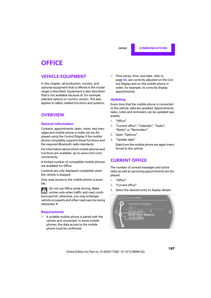 Office COMMUNICATIONS 187OfficeVehicle equipmentIn this chapter, all production, country, and optional equipment that is offered in the model range is described. Equipment is also described that is not available be cause of, for example, selected options or count ry version. This also applies to safety related functions and systems.OverviewGeneral informationContacts, appointments, tasks, notes, text mes-sages and mobile phone e-mails can be dis-played using the Control Display if the mobile phone compatibly supports these functions and the required Bluetooth radio standards.For information about which mobile phones and functions are available, go to www.mini.com/connectivity.A limited number of compatible mobile phones are available for Office.Contents are only displayed completely when the vehicle is stopped.Only read access to the mobile phone is possi-ble.Do not use Office while driving. Make entries only when traffic and road condi-tions permit; otherwise, you may endanger vehicle occupants and other road users by being distracted.<Requirements>A suitable mobile phon e is paired with the vehicle and connected . In some mobile phones, the data access to the mobile phone must be confirmed.>Time zones, time, and date, refer to page66, are correctly adju sted on the Con-trol Display and on the mobile phone in order, for example, to correctly display appointments.UpdatingEvery time that the mobile phone is connected to the vehicle, data ar e updated. Appointments, tasks, notes and reminders can be updated sep-arately.1."Office"2."Current office", "C alendar", "Tasks", "Notes" or "Reminders"3.Open "Options".4."Update data"Data from the mobile phone are again trans-ferred to the vehicle.Current officeThe number of unread messages and active tasks as well as upcoming appointments are dis-played.1."Office"2."Current office"3.Select the desired entry to display details.