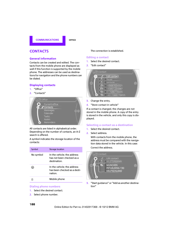COMMUNICATIONS Office188ContactsGeneral informationContacts can be create d and edited. The con-tacts from the mobile phone are displayed as well if this function is supported by the mobile phone. The addresses can be used as destina-tions for navigation and the phone numbers can be dialed.Displaying contacts1."Office"2."Contacts"All contacts are listed in alphabetical order. Depending on the number of contacts, an A-Z search is offered.A symbol indicates the st orage location of the contacts:Dialing phone numbers1.Select the desired contact.2.Select phone number.The connection is established.Editing a contact1.Select the desired contact.2."Edit contact"3.Change the entry.4."Store contact in vehicle"If a contact is change d, the changes are not stored in the mobile phone. A copy of the entry is stored in the vehicle, and only this copy is dis-played.Selecting a contact as a destination1.Select the desired contact.2.Select address.With contacts from the mobile phone, the address must be compared with the naviga-tion data stored in the vehicle. In this case:Correct the address.3."Start guidance" or "Add as another destina-tion"Symbol Storage locationNo symbol In the vehicle; the address has not been checked as a destination.In the vehicle; the address has been checked as a desti-nation.Mobile phone