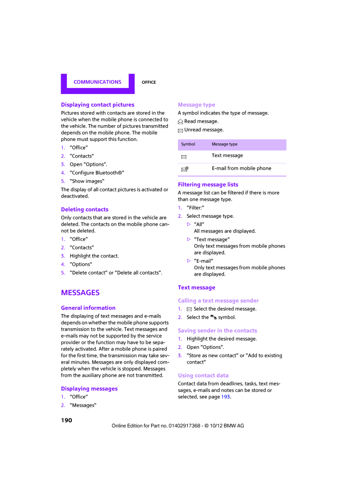 COMMUNICATIONS Office190Displaying contact picturesPictures stored with contacts are stored in the vehicle when the mobile phone is connected to the vehicle. The number of pictures transmitted depends on the mobile phone. The mobile phone must support this function.1."Office"2."Contacts"3.Open "Options".4."Configure Bluetooth(R)"5."Show images"The display of all contact pictures is activated or deactivated.Deleting contactsOnly contacts that are stored in the vehicle are deleted. The contacts on the mobile phone can-not be deleted.1."Office"2."Contacts"3.Highlight the contact.4."Options"5."Delete contact" or "Delete all contacts".MessagesGeneral informationThe displaying of text messages and e-mails depends on whether the mobile phone supports transmission to the vehicle. Text messages and e-mails may not be supported by the service provider or the function may have to be sepa-rately activated. After a mobile phone is paired for the first time, the transmission may take sev-eral minutes. Messages are only displayed com-pletely when the vehicle is stopped. Messages from the auxiliary phone are not transmitted.Displaying messages1."Office"2."Messages"Message typeA symbol indicates the type of message.Read message.Unread message.Filtering message listsA message list can be filtered if there is more than one message type.1."Filter:"2.Select message type.>"All"All messages are displayed.>"Text message"Only text messages from mobile phones are displayed.>"E-mail"Only text messages from mobile phones are displayed.Text messageCalling a text message sender1. Select the desired message.2.Select the symbol.Saving sender in the contacts1.Highlight the desired message.2.Open "Options".3."Store as new contact" or "Add to existing contact"Using contact dataContact data from deadli nes, tasks, text mes-sages, e-mails and notes can be stored or selected, see page 193.Symbol Message typeText messageE-mail from mobile phone