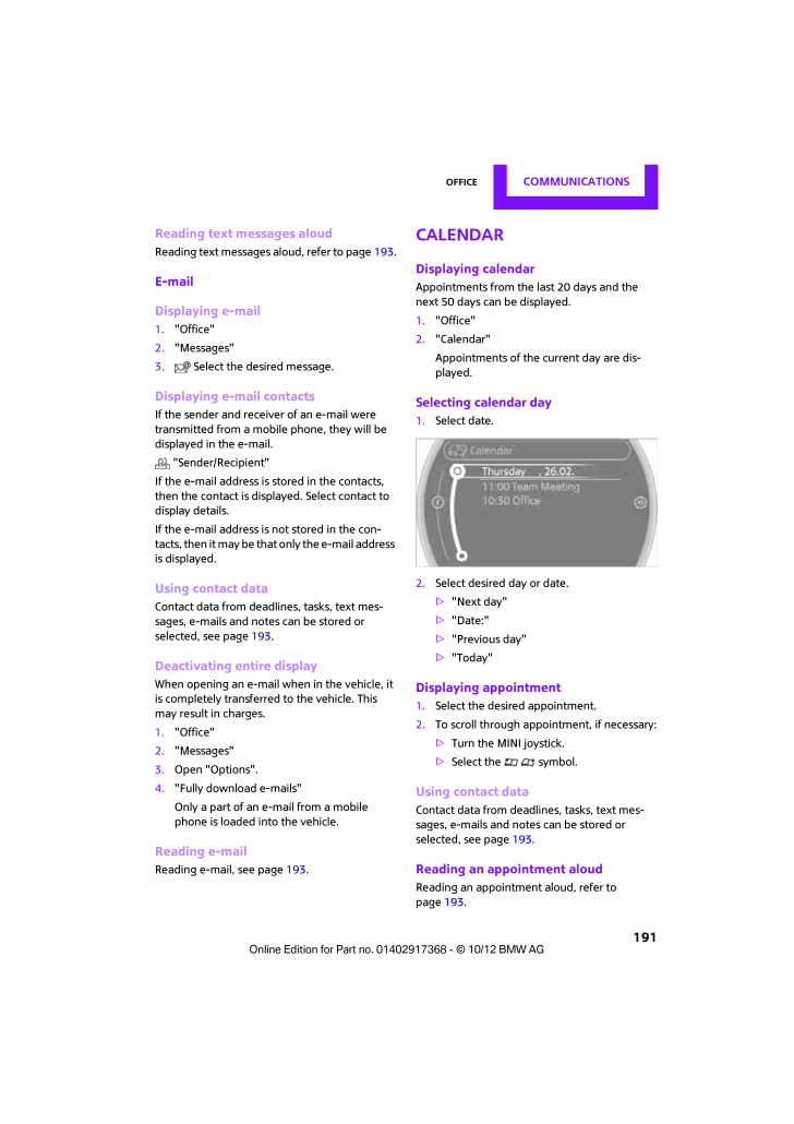 Office COMMUNICATIONS 191Reading text messages aloudReading text messages aloud, refer to page 193.E-mailDisplaying e-mail1."Office"2."Messages"3. Select the desired message.Displaying e-mail contactsIf the sender and receiver of an e-mail were transmitted from a mobile phone, they will be displayed in the e-mail."Sender/Recipient"If the e-mail address is stored in the contacts, then the contact is displayed. Select contact to display details.If the e-mail address is not stored in the con-tacts, then it may be that only the e-mail address is displayed.Using contact dataContact data from deadlines, tasks, text mes-sages, e-mails and notes can be stored or selected, see page 193.Deactivating entire displayWhen opening an e-mail when in the vehicle, it is completely transferred to the vehicle. This may result in charges.1."Office"2."Messages"3.Open "Options".4."Fully download e-mails"Only a part of an e-mail from a mobile phone is loaded into the vehicle.Reading e-mailReading e-mail, see page 193.CalendarDisplaying calendarAppointments from the last 20 days and the next 50 days can be displayed.1."Office"2."Calendar"Appointments of the current day are dis-played.Selecting calendar day1.Select date.2.Select desired day or date.>"Next day">"Date:">"Previous day">"Today"Displaying appointment1.Select the desired appointment.2.To scroll through appointment, if necessary:>Turn the MINI joystick.>Select the symbol.Using contact dataContact data from deadli nes, tasks, text mes-sages, e-mails and notes can be stored or selected, see page 193.Reading an appointment aloudReading an appointment aloud, refer to page193.