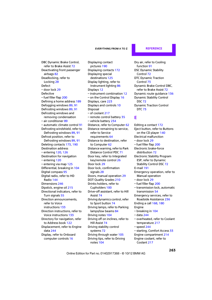 Everything from A to Z REFERENCE 263DBC Dynamic Brake Control, refer to Brake Assist 72Deactivating front passenger airbags82Deadlocking, refer to Locking28Defect- door lock29Defective- fuel filler flap200Defining a home address 189Defogging windows 89,91Defrosting windows 89,91Defrosting windows and removing condensation- air conditioner89- automatic climate control 91Defrosting windshield, refer to Defrosting windows 89,91Defrost position, refer to Defrosting windows 89,91Deleting contacts173,190Destination address- entering120,126Destination for navigation- entering120- entering via map 125Differential, breaking in 104Digital compass95Digital radio, refer to HD Radio144Dimensions246Dipstick, engine oil 215Directional indicators, refer to Turn signals55Direction announcements, refer to Voice instructions133Direction instructions, refer to Voice instructions133Directory for navigation, refer to Address book122Displacement, refer to Engine data244Display, refer to Onboard computer controls 16Displaying contact pictures190Displaying contacts 172Displaying special destinations125Display lighting, refer to Instrument lighting 86Displays12- instrument combination 12- on the Control Display 16Displays, care223Displays and controls10Disposal- of coolant217- remote control battery 35- vehicle battery234Distance, refer to Computer62Distance remaining to service, refer to Service requirements64Distance to destination, refer to Computer62Distance warning, refer to Park Distance Control PDC 71Door key, refer to Integrated key/remote control 26Door lock29Door lock, confirmation signals28Doors, manual operation 29DOT Quality Grades 210Drinks holders, refer to Cupholders100Drive-off assistant, refer to Hill Assist74Driving dynamics control, refer to Sport button74Driving lamps, refer to Parking lamps/low beams 84Driving notes104Driving off on inclines, refer to Hill Assist74Driving stability control systems72Driving through water 105Driving tips, refer to Driving notes104Dry air, refer to Cooling function91DSC Dynamic Stability Control72DTC Dynamic Traction Control73Dynamic Brake Control DBC, refer to Brake Assist 72Dynamic route guidance 136Dynamic Stability Control DSC72Dynamic Traction Control DTC73EEditing a contact172Eject button, refer to Buttons on the CD player140Electrical malfunction- door lock29- fuel filler flap200Electronic brake-force distribution72Electronic Stability Program ESP, refer to Dynamic Stability Control DSC 72E-mail191Emergency operation, refer to Manual operation- door lock29- fuel filler flap200- transmission lock, automatic transmission54Emergency services, refer to Roadside Assistance 236Ending a call168,180Engine- breaking in104- data244- overheated, refer to Coolant temperature217- speed244- starting, Comfort Access 33Engine compartment 214Engine coolant, refer to Coolant217