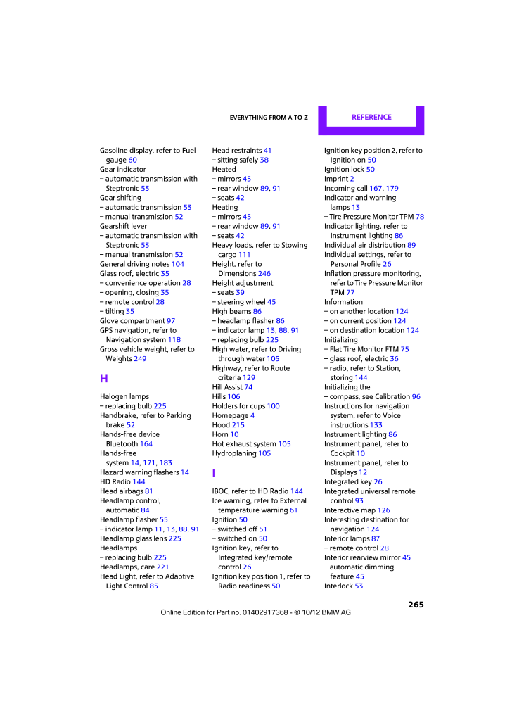 Everything from A to Z REFERENCE 265Gasoline display, refer to Fuel gauge60Gear indicator- automatic transmission with Steptronic53Gear shifting- automatic transmission 53- manual transmission 52Gearshift lever- automatic transmission with Steptronic53- manual transmission 52General driving notes 104Glass roof, electric35- convenience operation 28- opening, closing 35- remote control28- tilting35Glove compartment 97GPS navigation, refer to Navigation system 118Gross vehicle weight, refer to Weights249HHalogen lamps- replacing bulb225Handbrake, refer to Parking brake52Hands-free device Bluetooth164Hands-free system14,171,183Hazard warning flashers 14HD Radio144Head airbags81Headlamp control, automatic84Headlamp flasher55- indicator lamp11,13,88,91Headlamp glass lens 225Headlamps- replacing bulb225Headlamps, care221Head Light, refer to Adaptive Light Control85Head restraints41- sitting safely38Heated- mirrors45- rear window89,91- seats42Heating- mirrors45- rear window89,91- seats42Heavy loads, refer to Stowing cargo111Height, refer to Dimensions246Height adjustment- seats39- steering wheel45High beams86- headlamp flasher 86- indicator lamp13,88,91- replacing bulb225High water, refer to Driving through water105Highway, refer to Route criteria129Hill Assist74Hills106Holders for cups100Homepage4Hood215Horn10Hot exhaust system105Hydroplaning105IIBOC, refer to HD Radio 144Ice warning, refer to External temperature warning 61Ignition50- switched off51- switched on50Ignition key, refer to Integrated key/remote control26Ignition key position 1, refer to Radio readiness50Ignition key position 2, refer to Ignition on50Ignition lock50Imprint2Incoming call167,179Indicator and warning lamps13- Tire Pressure Monitor TPM 78Indicator lighting, refer to Instrument lighting 86Individual air distribution 89Individual settings, refer to Personal Profile26Inflation pressure monitoring, refer to Tire Pressure Monitor TPM77Information- on another location 124- on current position 124- on destination location 124Initializing- Flat Tire Monitor FTM 75- glass roof, electric 36- radio, refer to Station, storing144Initializing the- compass, see Calibration 96Instructions for navigation system, refer to Voice instructions133Instrument lighting 86Instrument panel, refer to Cockpit10Instrument panel, refer to Displays12Integrated key26Integrated universal remote control93Interactive map126Interesting destination for navigation124Interior lamps87- remote control28Interior rearview mirror 45- automatic dimming feature45Interlock53