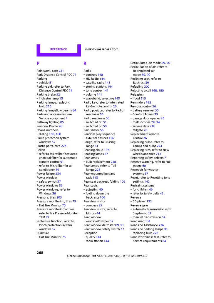REFERENCE Everything from A to Z268PPaintwork, care221Park Distance Control PDC 71Parking- vehicle51Parking aid, refer to Park Distance Control PDC 71Parking brake52- indicator lamp13Parking lamps, replacing bulb226Parking lamps/low beams 84Parts and accessories, see Vehicle equipment 4Pathway lighting85Personal Profile26Phone numbers- dialing168,180Pinch protection system- windows37Plastic parts, care223Pollen- refer to Microfilter/activated-charcoal filter for automatic climate control91- refer to Microfilter for air conditioner89Power failure234Power window- safety switch37Power windows36Power windows, refer to Windows36Pressure, tires203Pressure monitoring, tires75- Flat Tire Monitor 75Pressure monitoring of tires, refer to Tire Pressure Monitor TPM77Protective function, refer to Pinch protection system- windows37Puncture- Flat Tire Monitor 75RRadio- controls140- HD Radio144- satellite radio145- storing stations144- tone control141- volume141- waveband, selecting 143Radio key, refer to Integrated key/remote control 26Radio position, refer to Radio readiness50Radio readiness50- switched off51- switched on50Rain sensor56Random play sequence- external devices 156Range, refer to Cruising range61Reading aloud193Reading lamps87Rear lamps- bulb replacement 228Rear lamps, refer to Tail lamps228Rear-mounted luggage rack113Rear seat backrest, folding106Rear seats- adjusting40- folding down the backrests106Rearview mirror- compass95Rearview mirror, refer to Mirrors44Rear window- windshield wiper 57Rear window defroster 89,91Rear window safety switch 37Reception- quality144- radio station144Recirculated-air mode 89,90Recirculation of air, refer to Recirculated-air mode89,90Reclining seat, refer to Backrest39Refueling200Rejecting a call168,180Releasing- hood215Reminders192Remote control26- battery renewal35- Comfort Access33- garage door opener93- malfunctions29,34- service data218- tailgate28Replacement remote control26Replacing bulbs, refer to Lamps and bulbs224Replacing tires, refer to New wheels and tires212Reporting safety defects 7Reserve warning, refer to Fuel gauge60Reservoir for washer systems57Reset, refer to Resetting tone settings142Restraint systems- for children46- refer to Safety belts 42Reverse- CD player152Reverse gear- automatic transmission with Steptronic53- manual transmission 52Road map131Roadside Assistance 236Roadside parking lamps 86- replacing bulb226Road worthiness test, refer to Service requirements 64