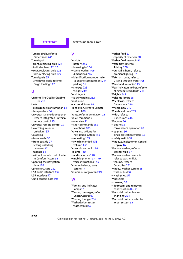 REFERENCE Everything from A to Z272Turning circle, refer to Dimensions246Turn signal- front, replacing bulb 226- indicator lamp12,13- rear, replacing bulb 228- side, replacing bulb 227Turn signals55Tying down loads, refer to Cargo loading112UUniform Tire Quality Grading UTQR210Units- average fuel consumption 64- temperature64Universal garage door opener, refer to Integrated universal remote control93Universal remote control 93Unlatching, refer to Unlocking33Unlocking- from inside30- from outside27- setting unlocking behavior27- tailgate34- without remote control, refer to Comfort Access 33Updating the navigation data118Upholstery, care222USB audio interface 154USB interface97Using contact data 193VVehicle- battery233- breaking in104- cargo loading106- dimensions246- identification number, refer to Engine compartment 214- parking51- storage223- weight249Vehicle jack- jacking points232Ventilation- air conditioner92Ventilation, refer to Climate control88Vents, refer to Ventilation 92Voice commands- overview21- short commands 252- telephone183Voice instructions for navigation system 133- repeating133- switching on/off 133- volume133Voice phone book 184Volume140- audio sources140- mobile phone167,179- voice instructions 133Volume balance, tone setting141Volume of cargo area 249WWarning and indicator lamps13Warning messages, refer to Check Control67Warning triangle236Washer/wiper system- washer fluid57Washer fluid57- capacity of reservoir 58Washer fluid reservoir 57Waste tray, refer to Ashtray100Waterfall lighting, refer to Ambient lighting87Water on roads, refer to Driving through water 105Waveband for radio 143Wear indicators in tires, refer to Minimum tread depth 211Weights249Welcome lamps85Wheelbase, refer to Dimensions246Wheels, new212Wheels and tires203Width, refer to Dimensions246Windows36- closing36- convenience operation 28- opening36- pinch protection system 37- safety switch37Windows, indicator on Control Display16Window washer, refer to Washer fluid57Window washer reservoir, refer to Washer fluid- volume, refer to Capacities251Window washer system 55- washer fluid57- washer jets57Windshield- cleaning57- defrosting and removing condensation89,91Windshield wiper blades, changing224Windshield wipers, refer to Wiper system55